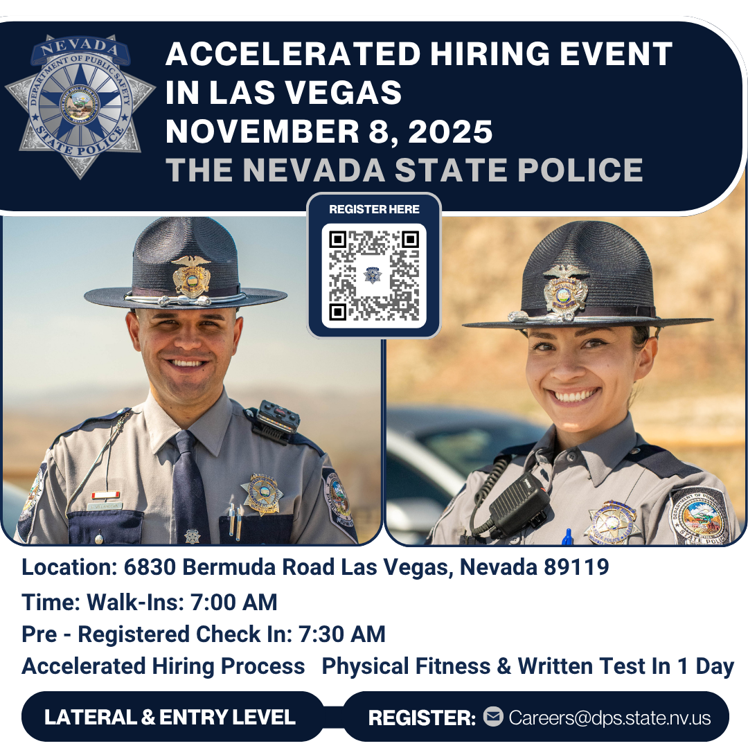 DPS Officers perform a variety of law enforcement and public safety functions within the Department of Public Safety (DPS). Applicants must pass a written and physical fitness examination and demonstrate they have the ability to prepare to be a DPS Officer. Incumbents at this level are initially assigned to the Nevada P.O.S.T. academy where they are trained to perform law enforcement duties as well as other course work and physical training intended to provide the knowledge and skills to function as a DPS Officer. The instruction and training are provided in a formal classroom setting and in practical field exercises where Academy staff will review and evaluate each cadet's class participation, coursework, assignments, and written performance examinations. Successful completion of the training academy is mandatory for continued employment as a DPS Officer I; therefore, incumbents progress to the next level in the series upon successful completion of the law enforcement academy, meeting minimum qualifications, satisfactory performance and with the recommendation of the appointing authority.